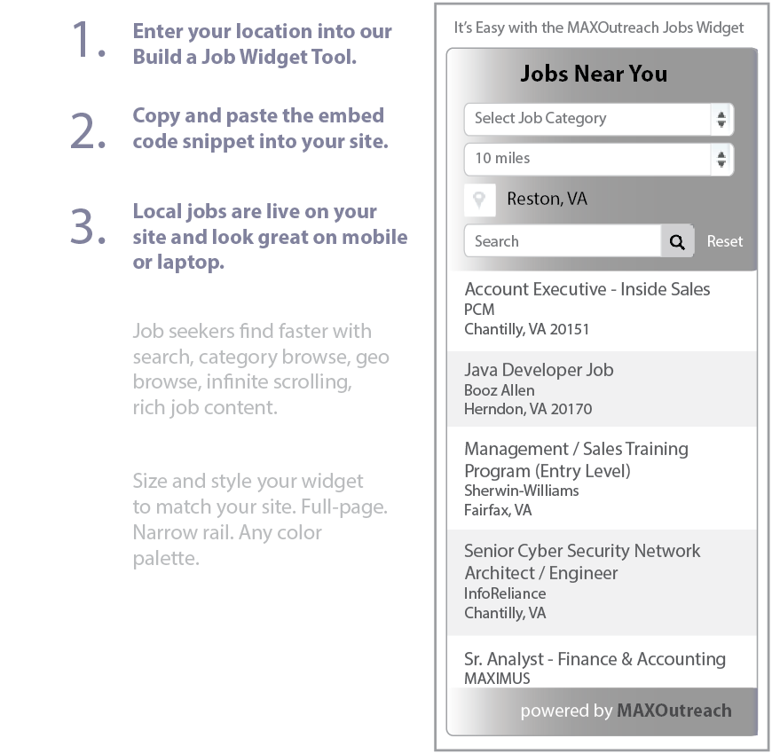 Whether your organization wants to place the widget’s 400,000 jobs per month on a public webpage or place them behind a job-seeker login page, the MAXOutreach Job Widget is a powerful tool for your constituents